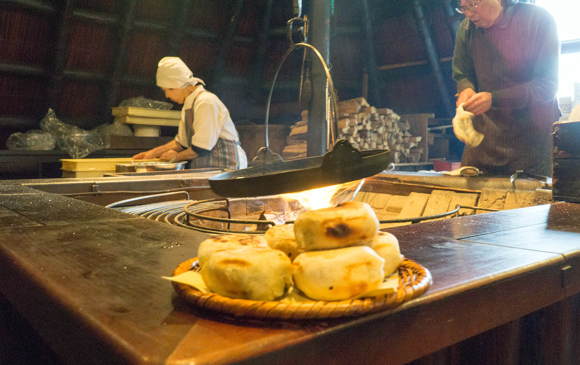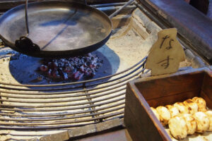 おやき村では、囲炉裏いろり端で地元のおばあちゃん・おじちゃんたちがおやきを焼くのを見せてもらい、その場でいただくか持ち帰れます。食堂で打ち立ての蕎麦と共に食べることもできます。囲炉裏端でのおやき作り体験もできます。
