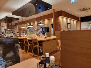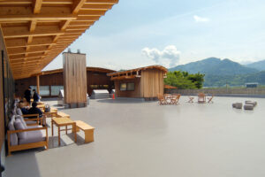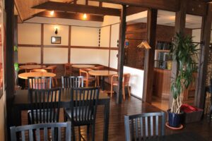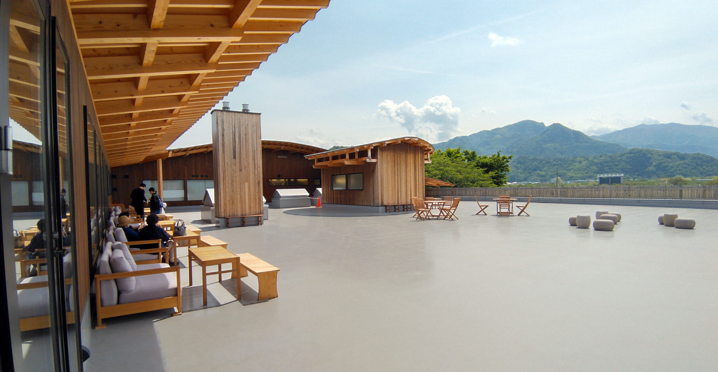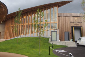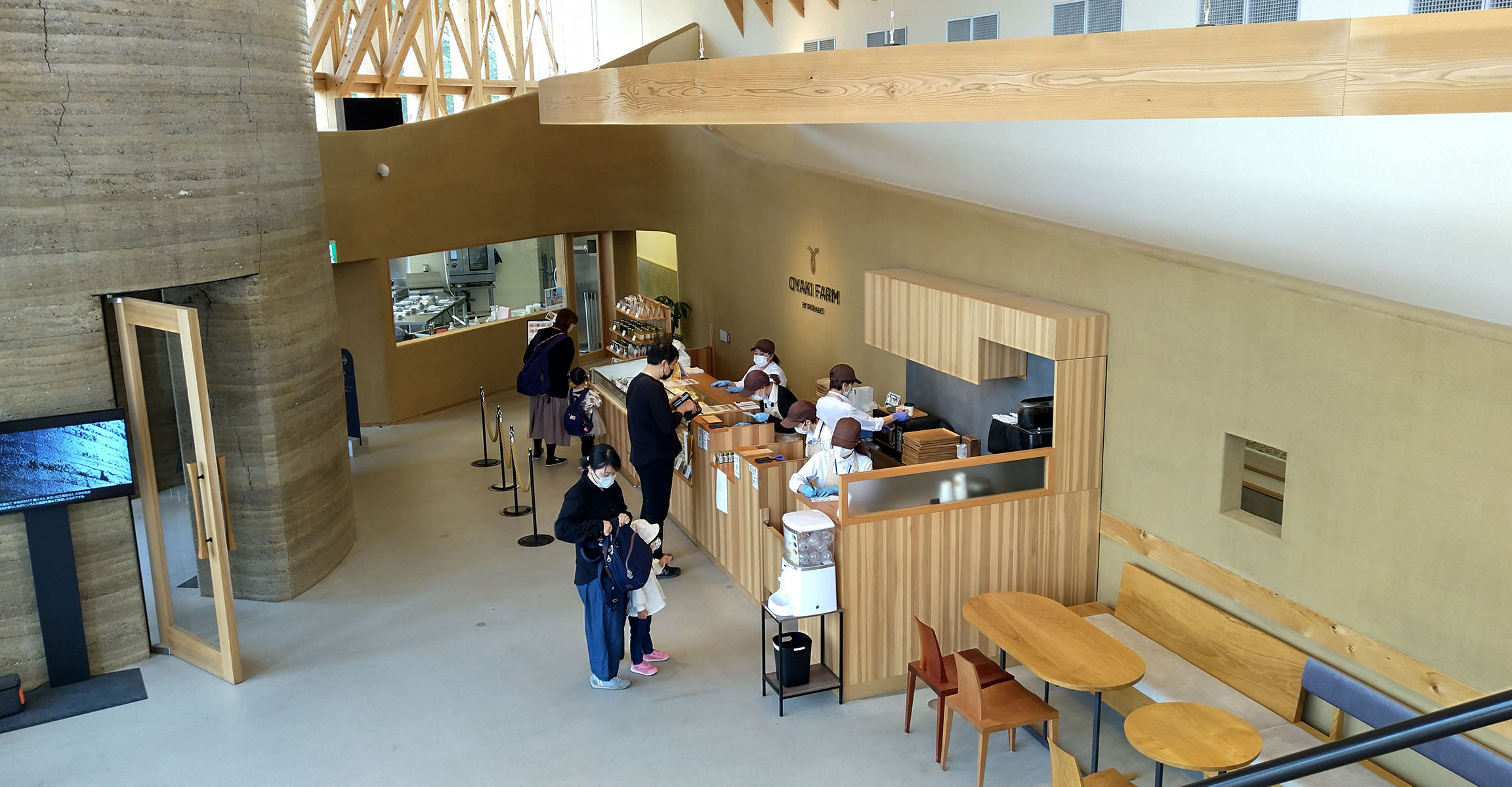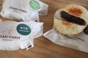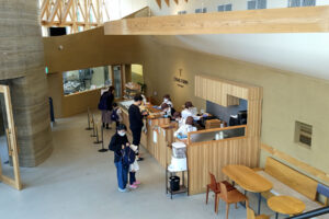 美しいデザインの建物で、焼きたてのおやきを買って、2Fの見晴らしの良いデッキでソファーにもたれて食べたり、店舗周辺の芝生とベンチのある広場で食べたり、施設内にあるカフェでも食べられます。