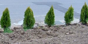 庭作りの第2段として、庭木を買って植えました。道路と畑の境界に、写真のコノテガシワを植え、知り合いの種苗園の方に相談して、何本かの木と植える場所を決定。