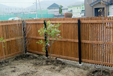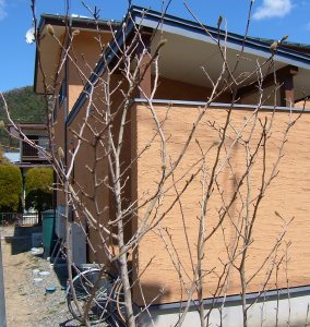 妻が好きな、寒い地方ならではのライラック(リラの木)2本、安曇野ちひろ美術館などで妻が見て気に入ったというヤマボウシ、そして一番右には自分の好きなブナの木。