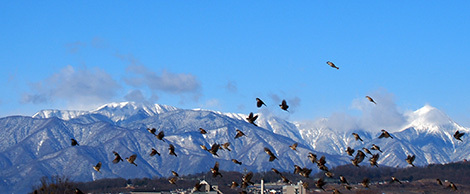 昨日の夕暮れ時、自転車で行く道で、近くの田んぼとアルプスにかかる雲が、今まで見たことのない幻想的な光景を見せてくれました。