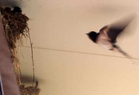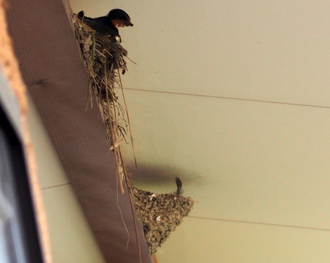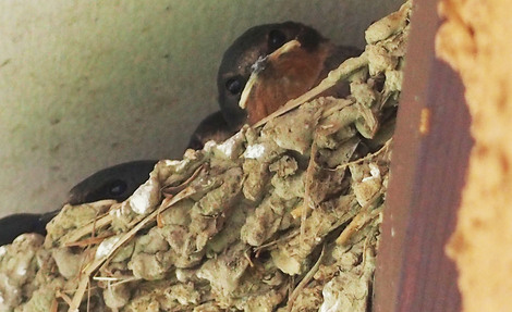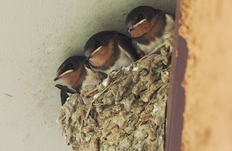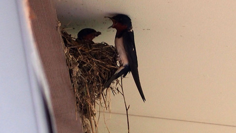 猛暑の中、今頃になって軒下の古巣でツバメが子育て中。