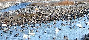 今年は新潟が大雪でエサ不足のためせいで、例年より多い1300羽以上が飛来していると書いてあった(どうやって数えるんだろう?)。