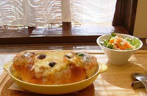 日曜日、松本検定の試験官をやった帰り、emico misawaさんの写真展をやっている「元町カフェ」に行き、「パングラタン」というランチメニューを食べて来ました。
