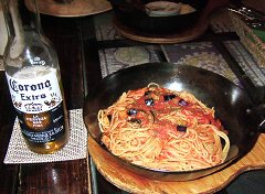 写真はナスとアンチョビのトマトソースパスタと、メキシコのコロナビール。