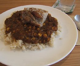 トンポウロウのように煮こんだ豚肉、豆の入ったルウ、玄米が適当に混じった御飯。3つを一緒に食べるととっても美味しい。