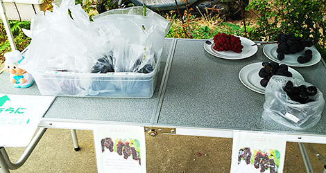 いわゆる「ハネ出し・ワケあり」ブドウで、巨峰・シャインマスカットが100~300円、デラウエア2房100円。