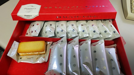 松本あめ市の抽選で当たった「信州りんごバターサンドクッキー」。