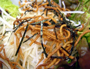 オリジナルの「一歩サラダ」は、揚げた蕎麦が載っていて好評。