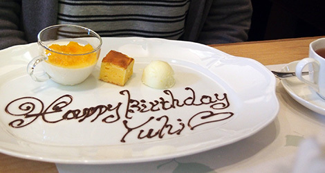 デザートのプレートに誕生日のメッセージをチョコで書いてもらい、サプライズで楽しい食事となりました。