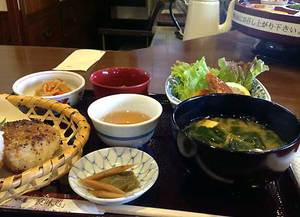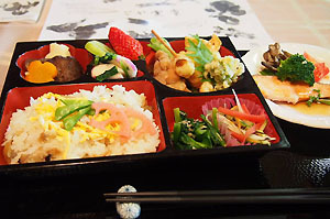 阿智村の満蒙開拓平和記念館訪問の後は、すぐそばにある、村の女性たちのNPOによる「伍和(ごか)食堂」で、写真のような美しい弁当を頂きました。予約制のようですが、地元の旬の食材を使った手作りの美味しい弁当です。