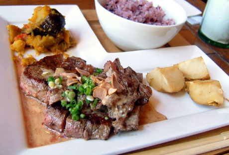 どこを向いても丸太と木材、天井・壁・床・テーブル・椅子すべて木製の見事なログハウスで、美味しい肉や野菜を頂けます。