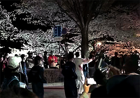 うまく撮れなかったが満開の桜の松本城での聖火リレーです。