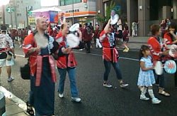歩行者天国のあっちこっちでにぎやかい演奏やお神輿をやっていて、写真の琉球太鼓の演奏を少し聞いたが、なかなかよかった。