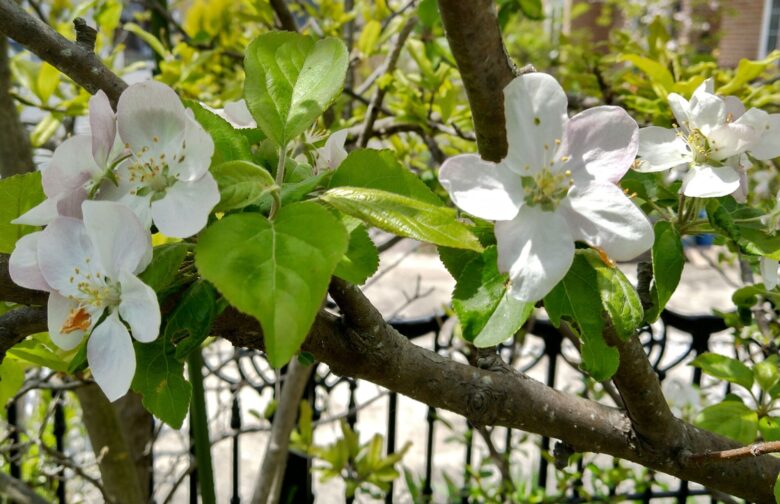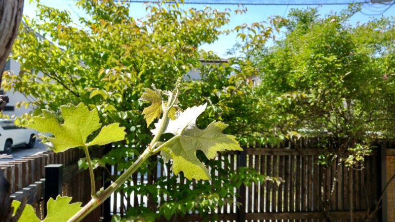 庭の木々から新緑、ブドウは小さいつぼみが。