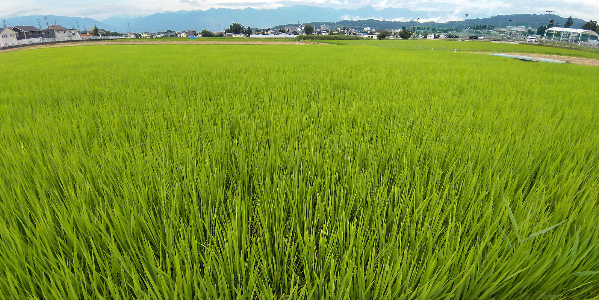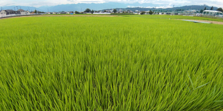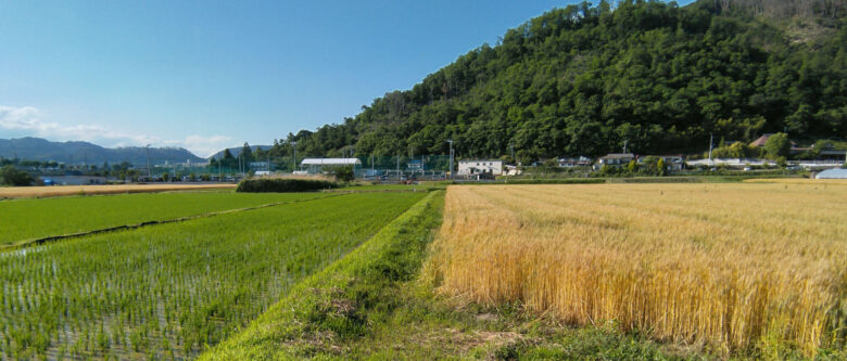 花の向こうに新タマネギ、田植えが終わった田んぼ、収穫前の麦、そしてまだ少し残雪があるアルプス。