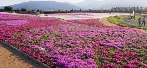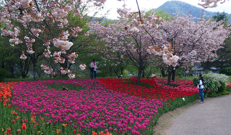 今年は信州花フェスタで本数を増やしていて、38万本あるそうです。桜もまだ咲いていて、これこそインスタ映えする美しさでした。
