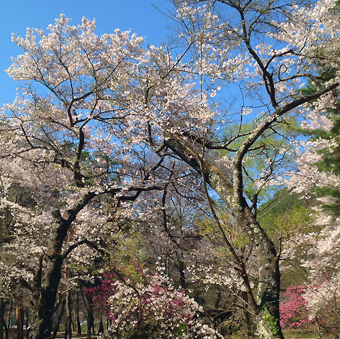 春が異常に早かった今年は、都会や信州でも平地はとっくに桜は散りましたが、山の中でこんな所にまだ綺麗に咲いているのを見ると嬉しいです。