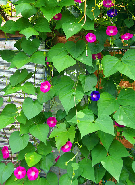 今年のうちの「緑のカーテン」は、琉球朝顔・キュウリ・インゲン豆・ブドウ。
