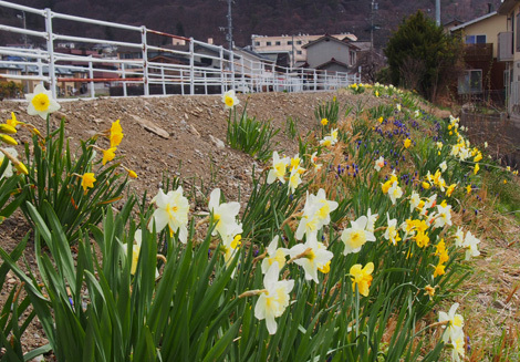 出張での長野市への途中、冠着駅で見事な桜とピンク色の花が咲いてました。