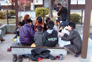 長野県内のあちこちから来たこども記者とその親御さん、信州大学の留学生と英語のネイティブ、ガイド・通訳・記者の方々、全部で20人ぐらいで、浅間温泉のあちこちを歩いて回り、最後は「ホットプラザ浅間」前の小さな足湯。