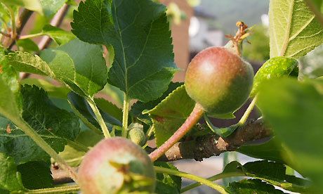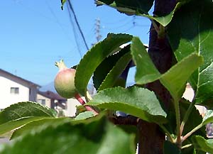 庭に植えたリンゴが4年目に花が咲き、その後小さな可愛い実も2個成ったと思ったら、昨日見たらなくなって1個は下に落ちていた。