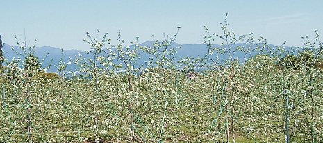見渡すかぎりのリンゴ畑で、白いリンゴの花が満開。