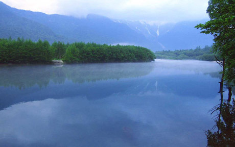 好天ではなかったが、梅雨時で湿度が高いために出ていた夕霧が似合う大正池。