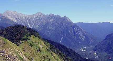 上高地から焼岳に登るルートは、途中、写真のように、穂高連峰が真正面に、はるか下に上高地の大正池やホテル群が見えて爽快(写真右端の極小の赤い屋根がかの上高地帝国ホテル)。