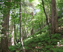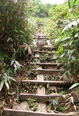 ここは低山だが急斜面が多く、ハシゴが50箇所以上というコース。確かに、写真のように、ロープの付いたハシゴがいくつもあるが、さすが木曽の山で、すべて木でできている。