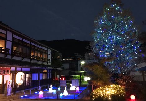 イルミネーションを専門に手がける中学時代の同級生の会社に依頼し、カツラの大木2本の星のように瞬くイルミネーションと、松本城をモチーフにした他では見られない和風のイルミネーションです。足湯に浸かりながら見ることもできます。
