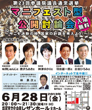 今日6/28夜、塩尻で参院選長野選挙区候補者5人による公開討論会が開かれるようです。