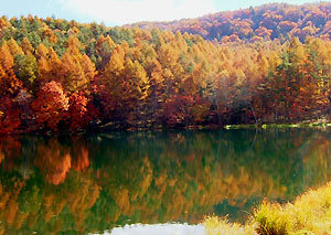 池に映るカラマツなどがあまりに美しい。