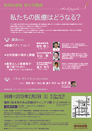 2/2(土)に信州自遊塾の第10回講座「私たちの医療はどうなる?」が開かれます。