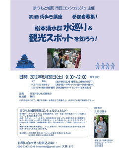 今週土曜日、観光ボランティア団体「まつもと城町市民コンシェルジュ」が、街歩き講座「松本湧水群水巡り&観光スポットを知ろう!」を行います。