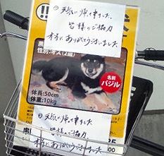 俳優で松本市民芸術館館長の串田和美さんの愛犬「バジル」君が行方不明になり、松本のあちこちで張り紙がされ、巷の話題にもなっていたが、無事見つかり、今日串田さんのお宅のそばにお礼のボードが置いてあった(串田さんの手書き文字かな?)。