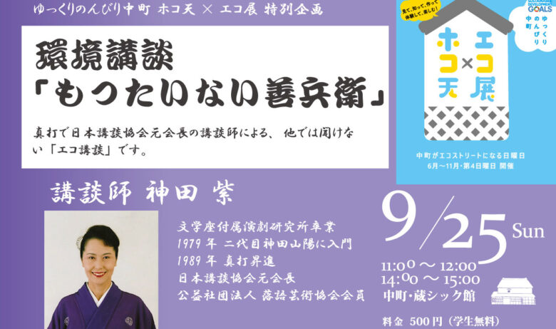 東京から、真打ちで日本講談協会元会長の講談師、神田紫先生にお越し頂き、「創作エコ講談 もったいない善兵衛」を語って頂きます。通常は入場料数千円の講談をワンコインでお聴き頂けるまたとない機会で… 続きを読む