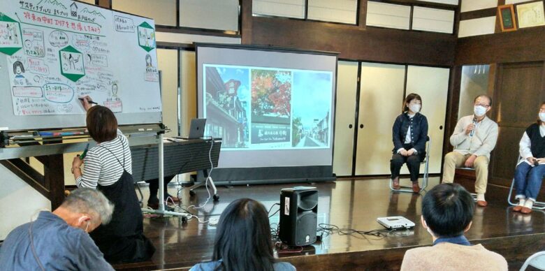 日曜の中町ホコ天×エコ展の催しの一つとして行われたサステナブルなまちづくり井戸端かいぎ「ホコ天研究パート1」。