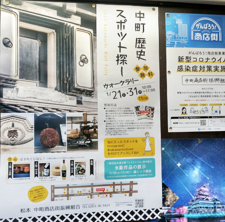 2年前に「Goto商店街」(現「がんばろう商店街」)に応募して採択された後、コロナ禍で延び延びになっていた「中町 歴史スポット探し ウォークラリー」イベントを、今週末の氷彫フェスティバルに合わせて1/21~31(日)に開催中です。