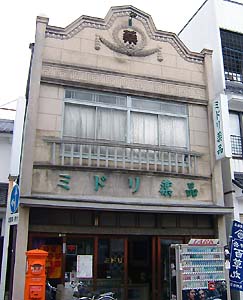 会社の2軒隣にある「ミドリ薬品」さんの建物は、昭和2年に建てられた「看板建築」様式。