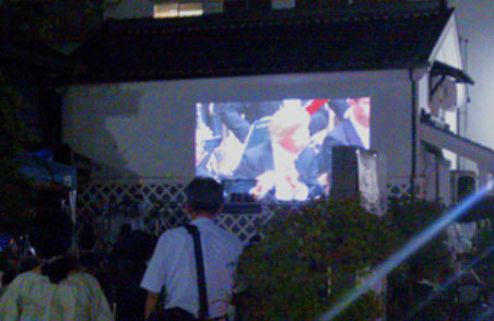 雨でスクリーンが濡れるため、蔵の漆喰の外壁に上映。