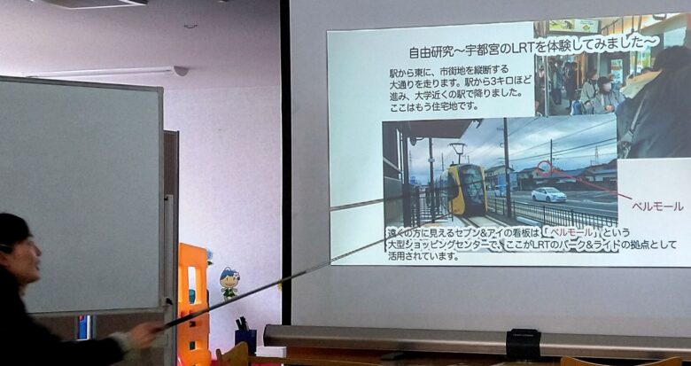 去年8月に開業した宇都宮市のLRT(路面電車)の乗車体験レポートを聞き、どうすれば車社会から公共交通や自転車の利用を増やせるかについてアイディアを出し合いました。