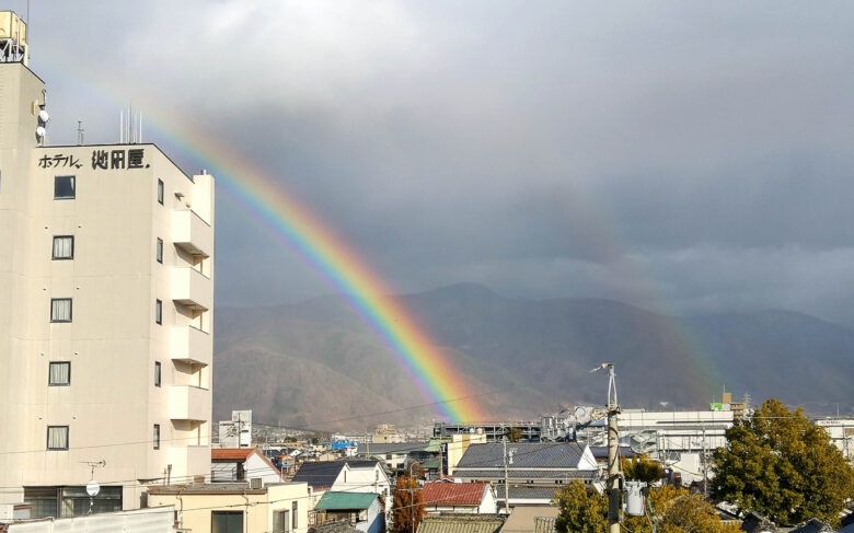 一昨日午後、中町通りにある会社の窓から虹が見えました。この方向に虹が見えることは時々あるが、こんなにくっきり見えたのは初めて。