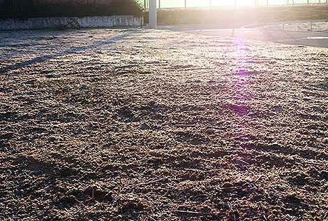 遠くに冠雪したアルプス、家の前の空き地は一面の霜がキラキラ。