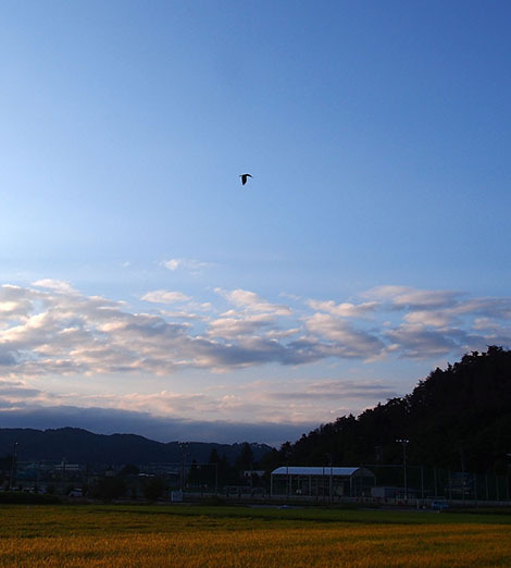 稲田の上を飛ぶトンビ。