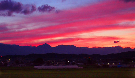 ふと気づくと空が真っ赤に染まっていて、刻一刻と変わるので、急いでカメラを持ち、ついでに寝ている犬を起こして散歩に連れ出し、撮ってきました。