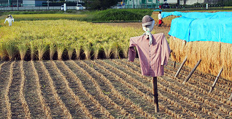 収穫の秋になり、信州のあちこちの田んぼで、昔ながらの案山子(かかし)が見られる季節。