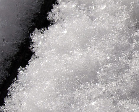 春の雪は雨っぽくて重いことが多いけど、数日前に降った雪はさらさらでものの見事に結晶していて、積もった雪の結晶の形がはっきり見えるほど。