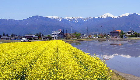 天気が最高で、途中、安曇野のスイス村の菜の花とアルプスがwonderfulでした。