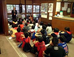 浅間温泉梅の湯での打ち合わせ中、小学生1クラスが旅館に、にぎやかにやって来た。